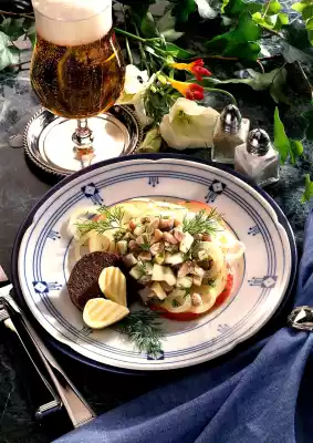 Wash the maties, dab dry and dice finely. Wash apples. Cut 2 apples into quarters, cut out the core. Cut the flesh into small cubes and sprinkle with lemon juice. Wash dill and chop except for a few flags for garnishing.