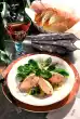 Mix the prepared ingredients. Season with some pepper. Peel onions and cut into rings. Cut out the core of the last apple. Cut the apple into thin slices, put them on plates and arrange the matyestatar with dill pennants and onion rings on top.
