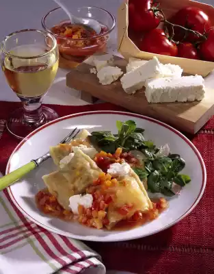 Steam 200 ml water, covered with prepared vegetables and butter for about 7 minutes. Season with salt and pepper. Stir in salsa. Wash and sort lamb's lettuce. Peel shallots and cut into fine slices. Season vinegar with salt, pepper and sugar. Gradually fold in the oil. Mix salad, onions and marinade. Arrange Maultaschen with sauce and salad in portions.