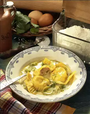 Halve the pasta dough and roll out both halves thinly. Spread the sausage meat in small heaps on a pastry sheet with a teaspoon of sausage meat mixture. Brush the spaces in between with water and place the second pastry sheet on top. Press down with a stirring spoon handle and cut into pieces with a knife. Press each Maultasche with a fork along the edge again. Cook the Maultaschen in plenty of boiling salted water for about 8 minutes. Meanwhile clean and wash the leek and cut it into fine rings. Bring leek and stock to the boil and simmer for 2-3 minutes. Add cream and season to taste with salt and pepper.