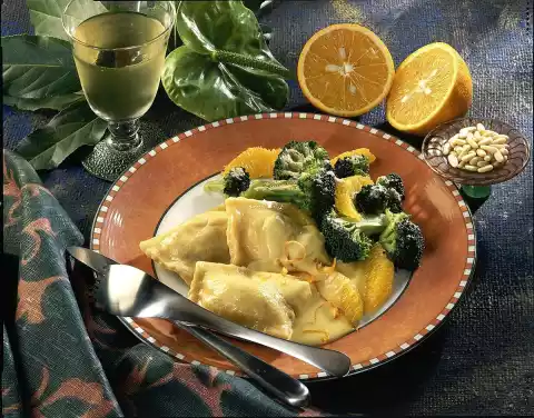 Arrange Maultaschen, vegetables and sauce on a plate and serve garnished with orange julienne as desired.