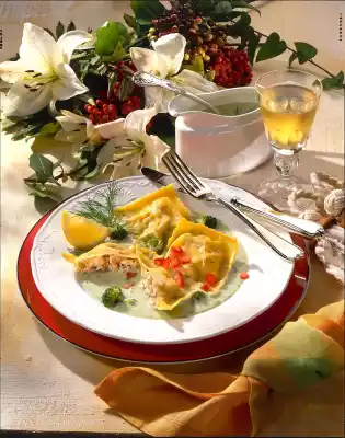 Add the remaining broccoli florets and heat up again briefly. Season to taste with salt, pepper and nutmeg. Clean, wash, quarter and seed the tomato. Cut into small cubes. Drain Maultaschen well and arrange on plates with the sauce.