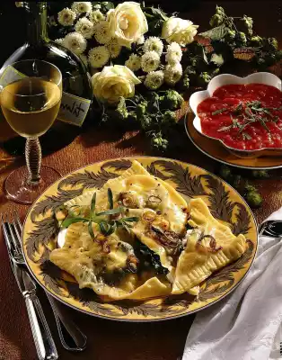 Peel the remaining onion, cut into rings and fry in hot fat until crispy. Arrange Maultaschen in portions on preheated plates with onion rings. Add tomato sauce. Garnish Maultaschen and tomato sauce with tarragon.