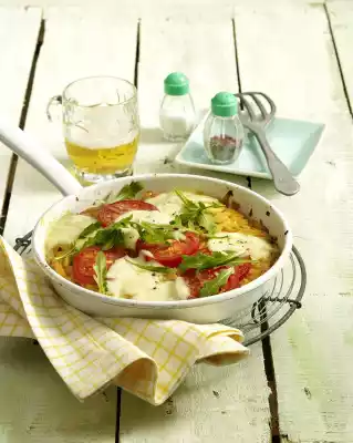 Drain the mozzarella and cut into slices. Wash and clean the tomato and also cut it into slices. Wash and clean the rocket and drain well. Top the Rösti with tomato and mozzarella. Cover and continue cooking for 1-2 minutes until the cheese has melted slightly. Season with salt and pepper and sprinkle with rocket