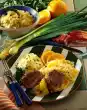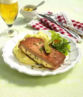 Remove the pot from the heat and add cold milk. Quickly stir in the remaining puree flakes. Heat the oil in a pan. Fry the slices of liver cheese for about 5 minutes while turning, remove and cut in half. Arrange with the puree on plates. Sprinkle with the remaining chive rolls. Garnish with cornichon halves, lettuce leaves and tomato slices