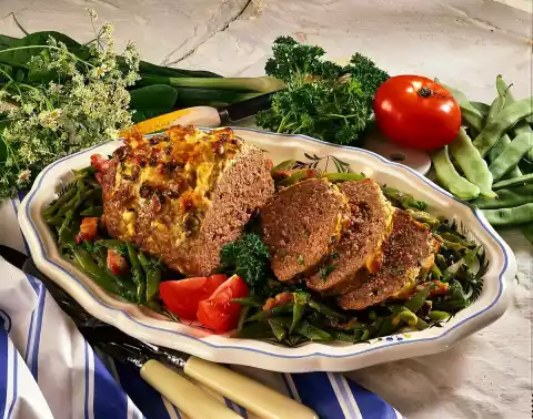 Season to taste with salt, pepper and mustard. Shape the meatloaf and place it on a baking tray coated with oil. Roast in the preheated oven (electric cooker: 200 °C/ gas: level 3) for about one hour. In the meantime, mix the remaining onions, cream cheese and egg yolk for the crust.
