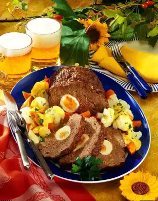 Season with salt and pepper. Form an oval loaf from the mince mixture, pressing hard-boiled eggs into the middle. Place the loaf on a cold rinsed fat pan of the oven and bake in the preheated oven (electric range: 200 °C/ gas: level 3) for approx. 45 minutes.