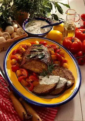 Strip and chop the remaining herbs from the stems. Mix yoghurt, half of the herbs and the remaining lemon juice. Season to taste with salt and pepper. Clean, wash and slice the tomatoes. Drain the pumpkin. Heat the fat. Steam tomatoes and pumpkin for 5 minutes. Season with salt and pepper. Sprinkle with remaining herbs. Arrange meatloaf and vegetables on a plate with some sauce. Garnish with herb bouquets