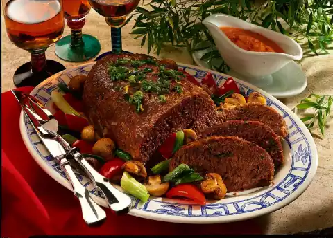 Halve the mushrooms. Heat the fat in a pot. Brown the mushrooms, add the spring onions and peppers and also fry them. Season with salt and pepper. Arrange meatloaf and vegetables on a plate. Garnish with spring onions and lemon peel. Pass the sauce extra
