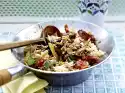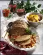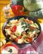 Place the roulades in a greased roasting pan. Cook in the preheated oven (electric range: 175 °C/ gas: level 2) for approx. 30 minutes. After about 10 minutes, deglaze with stock. Meanwhile peel and finely dice the remaining onion. Heat the oil in a pot and sauté the onion. Add tomatoes and tomato paste and boil up while stirring. Halve the rest of the olives, add to the sauce and stir in. Season to taste with salt and pepper. Wash the marjoram, pluck from the stalks and add to the sauce.