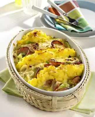 Season with horseradish, salt and pepper. Stir in slices of sausage. Drain the potatoes. Add 150 ml milk and 1 tablespoon butter and mash to a puree. Season with salt and nutmeg. Grease casserole dish.