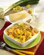 Pour in the puree in strips. Fill the sausage ragout into the spaces between the strips. Melt 1 tablespoon of butter and pour over the puree. Bake in the preheated oven (electric cooker: 200 °C/ convection oven: 175 °C/ gas mark 3) for approx. 25 minutes.