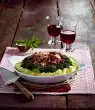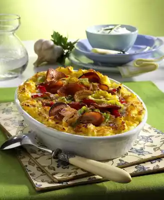 Add milk and fat mixture and mash everything to a puree. Season to taste with salt and nutmeg. Halve the pointed cabbage, clean, wash and cut into fine strips. Clean, wash and dice the peppers. Heat 1 tablespoon of oil in a large pan. Sauté the pointed cabbage in it. Add paprika and braise covered for about 5 minutes. Season with salt, pepper and nutmeg. Melt 1 tablespoon of fat in a saucepan. Sprinkle flour over it and sweat while stirring. Add 250 ml water and 150 ml milk while stirring. Bring to the boil, stir in broth and simmer for 5 minutes. Grease casserole dish. Pour puree onto the rim. Mix the pointed cabbage vegetables with the sausage and distribute in the dish. Season the sauce with salt and pepper and pour over the sausage ragout.