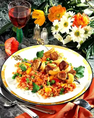 Add rice and sauté briefly. Deglaze with 3/8 litres of water and tomato juice, stir in broth. Let it swell for about 25 minutes at low heat. Clean and wash the tomatoes and peppers. Dice the tomatoes. Cut paprika into pieces. Add the tomatoes, peppers and peas to the rice about 10 minutes before the end of the cooking time and fold in. Season with salt, pepper and paprika. Wash the meat, dab dry and cut into 12 pieces. Put them on the skewers alternately with the onion slices. Heat 1 tablespoon of oil. Fry the skewers all around for 8-10 minutes.