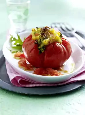 Drain and finely mash the potatoes, stirring in the milk and 5 tbsp. oil. Fold in rocket salad and 2/3 parmesan. Season to taste with salt and nutmeg. Fill the puree into the tomatoes. Place the tomatoes in a greased casserole dish.
