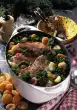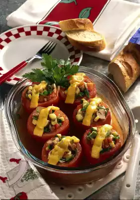 Pour the stock through a sieve and put it back into the mould. Add the tomatoes to the stock. Cover and cook at 600 watts for four to five minutes. Cut the cheese slice into six strips. Two minutes before the end of the cooking time, place the cheese strips on the tomatoes and let them melt as you continue cooking. Leave the finished tomatoes in the mould for two minutes. Serve garnished with parsley. Serve with fresh baguette or rice