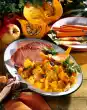Finely dice the bacon, put it in a microwave oven, cover and let it crisp for two minutes at 600 watts. Add mushrooms and zucchini, stir in, cover and steam at 600 watts for two minutes. Mix with diced tomatoes and spring onions and season with salt and pepper. Put 1/4 litre of water, stock cubes and tomato pulp in a wide microwave oven. Cover and cook for five minutes at 600 watts. In the meantime, spread the vegetable filling into the tomatoes. Pour the stock through a sieve and put it back into the mould. Add the tomatoes to the stock. Cover and cook at 600 watts for four to five minutes. Cut the cheese slice into six strips. Two minutes before the end of the cooking time, place the cheese strips on the tomatoes and let them melt as you continue cooking. Leave the finished tomatoes in the mould for two minutes.