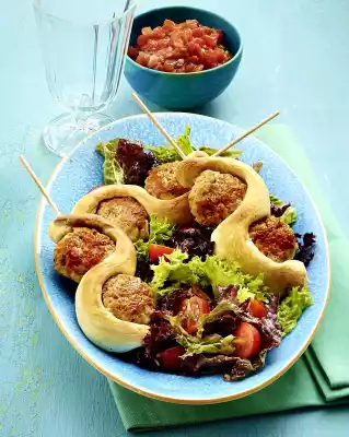 Meatball and bread skewer on salad with vinaigrette (mixed salad)