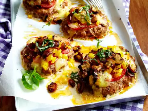 Knead minced meat, ground pork, egg, breadcrumbs, sweet paprika, pizza spice and 1 teaspoon salt. Form 4 flat thalers (approx. 12 cm Ø each) from the mince mixture and place them on a baking tray lined with baking paper.