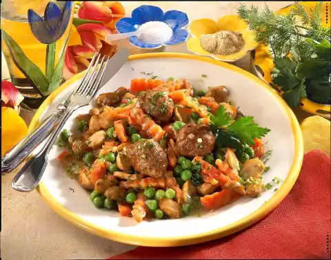 Peel and chop the onions. Wash, clean and slice the mushrooms. Heat oil in a pan and fry deep-frozen mini meatballs while turning. Add onions and mushrooms and fry. Pour in broth, add peas and roots and bring to the boil.