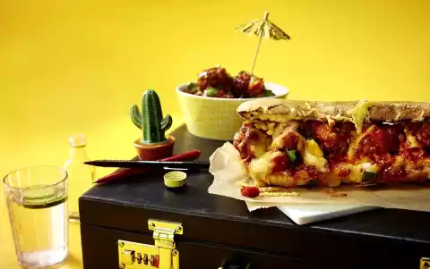 Spread about half the cheese on the cut surfaces of the upper baguette halves. Spread 3-4 meatballs with tomato sauce on the lower halves. Sprinkle with the rest of the cheese. Place all baguette halves on a baking tray and bake in a hot oven for about 5 minutes.