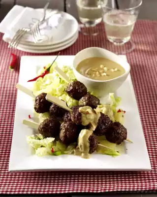 Add to the pineapple marinade. Pour the marinade over the cabbage. Put 3 meatballs on each skewer. Arrange the meatballs with cabbage salad and peanut sauce on a plate.