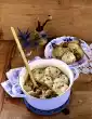 Squeeze the toasted bread well and knead with minced meat, onions, garlic, egg, diced tomatoes, pine nuts, thyme and tomato paste. Season with salt and pepper. Form 8 meatballs with your hands.