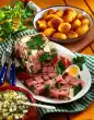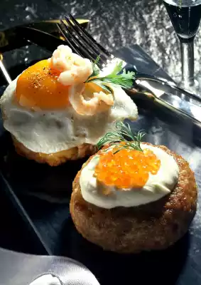 Heat 30 g fat in a pan and fry the meatballs for 10-15 minutes, turning them over. Fry 4 eggs in 20 g fat until they are fried. Season with salt and pepper and arrange on the meatballs.