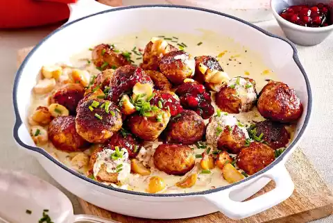 For the puree, drain the potatoes. Add milk and butter, mash everything finely. Season to taste with salt and nutmeg. Arrange meatballs with cranberries. Serve with mashed potatoes.