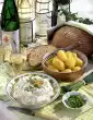 Boil the potatoes in water for 20 minutes. Peel and chop the onions. Steam half in fat. Wash and chop the parsley. Peel, mash and cool the potatoes. Knead with minced meat, egg, breadcrumbs, 5 tablespoons cream, steamed onions, 1/2 parsley, salt and pepper.