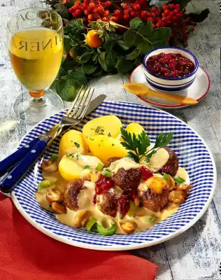 Bring to the boil, simmer for 1-2 minutes and sprinkle in the sauce thickener while stirring. Add the meatballs, bring to the boil briefly in the sauce, cover and cook for 4-5 minutes. Season to taste with salt and pepper. Wash parsley, dab dry and chop, except for a little to garnish. Drain the potatoes and arrange on plates together with the meatballs. Wash the parsley and chop it except for a little bit for garnishing. Serve sprinkled with parsley and garnished. Garnish with some cranberries, the rest is extra