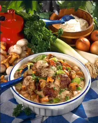 Form about 16 meatballs with wet hands. Clean and wash the mushrooms and chanterelles and pat them dry well. Depending on the size, possibly halve them. Clean, wash and cut the leek into rings. Heat the oil in a pan and fry the meatballs all around, turning them over. Take them out and fry the mushrooms in the hot frying fat as well. Finally add leek and braise. Deglaze with broth. Stir in crème-fraîche and sauce thickener and season with salt and pepper. Bring everything to the boil once and place in an ovenproof dish together with the meatballs.
