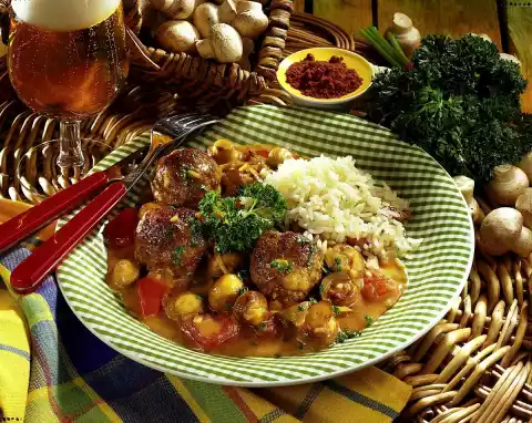 Put rice in boiling salted water. Let it swell for about 20 minutes at medium heat. Meanwhile mix minced meat, breadcrumbs and egg. Season to taste with salt, cayenne pepper and onion spice. Form small meatballs from it.