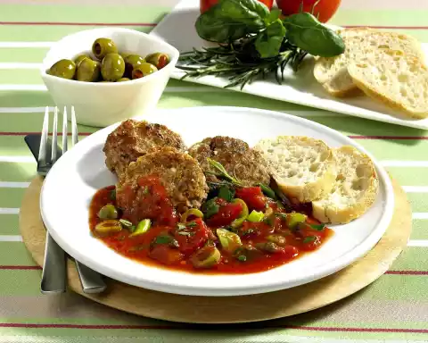 Fold in olive slices and herbs, season to taste with sugar, salt and pepper. Arrange the meatballs with the tomato sauce on plates, garnish with rosemary. Remaining extra olives are enough. Ciabatta tastes good with it.