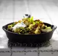 Fry the meatballs on both sides for about 5 minutes. Clean, wash and cut the spring onion into rings. Wash the herbs, dab dry, leave 1 sprig of rosemary to garnish. Pluck the rest of the leaves or needles from the stems and cut them into small pieces.
