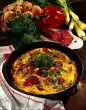 Drain the olives and cut half into slices. Heat 1 tablespoon of oil in a saucepan, sauté spring onions until translucent, add tomatoes in the juice. Coarsely chop the tomatoes with a spatula.
