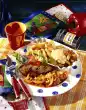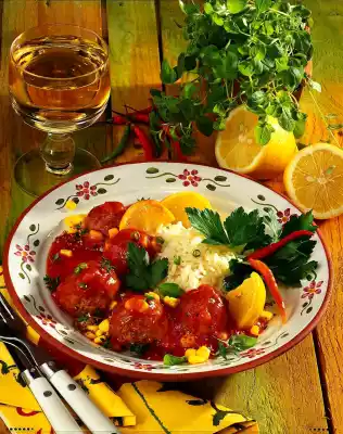 Add the corn. Stir in the sauce powder and let it boil for 1 minute. Season to taste with salt, pepper, lemon juice and dried herbs. Serve everything garnished with fresh herbs, lemon and chili.