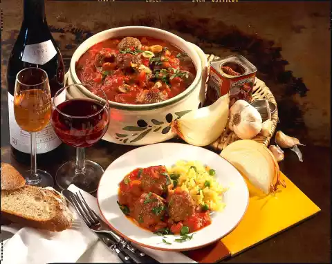 Fry the remaining onions and garlic slices in it (put 1 tablespoon aside for garnishing), dust with the remaining flour, stir and add the tomato puree, stock and remaining sherry. Bring to the boil, season to taste with salt, pepper and sugar and simmer over medium heat for about 25 minutes. Add meatballs to the sauce halfway through cooking and simmer until done. Wash parsley, dab dry and chop coarsely. Serve the alb¿ndigas in a terrine, sprinkled with the onion-garlic mixture put aside and the parsley. Serve with saffron rice with peas