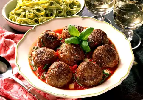 Add the dumplings to the tomato sauce and leave to stand for five minutes. Add the rest of the mozzarella to the sauce. Green ribbon noodles taste good with it.