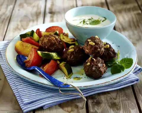 Roast the pine nuts in a pan without fat until golden brown, take them out. Peel and finely dice the onion and 1 clove of garlic. Knead the minced meat, breadcrumbs, egg, onion, garlic and half of the pine nuts well, season with salt, pepper, cinnamon and cumin.