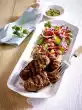 Serve on plates with zucchini and peach vegetables, garnish with mint. Add yoghurt.