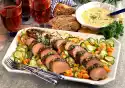 Wash and clean the zucchini, peel them in strips with a peeler. Halve lengthwise and cut into pieces. Quarter the peppers, clean, wash and cut into pieces. Place the vegetables in an ovenproof dish, drizzle 4-5 tablespoons of oil over them and sprinkle with sea salt.