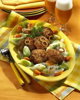 Pour 150 g cream into the stock. Stir the rest of the cream with flour until smooth and thicken the vegetables with it. Boil up while stirring. Add parsley, up to 1/2 tablespoon and season again. Arrange leek vegetables with meatballs and onion rings on a plate.