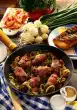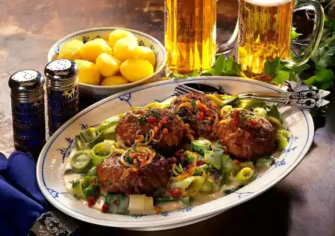 Add 150 g cream. Stir the rest of the cream and flour until smooth and thicken the vegetables with it. Bring to the boil while stirring and season to taste again. Arrange leek vegetables and meatballs with the onion rings on a plate.