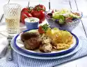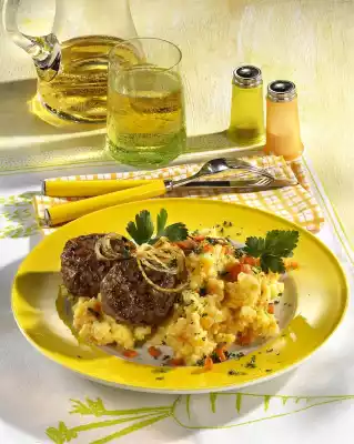 Drain the potato and carrot slices. Add hot milk and mash with a potato masher. Sprinkle the mashed potatoes and carrots with carrot cubes. Serve the meatballs and onion rings on four plates sprinkled with parsley.