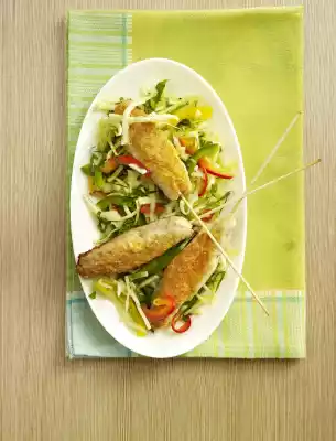 Knead minced meat, egg, onion, squeezed bread and mustard. Season with salt, pepper and paprika. Form 12 thumb-thick rolls (approx. 70 g each) from the mince. Stick skewers into them. Heat 1 tablespoon of oil in a frying pan and fry the skewers in it in portions all around for about 7 minutes until golden brown. In the meantime, add paprika and mint to the salad and season with sugar, salt and pepper. Arrange salad and skewers on plates