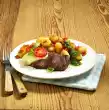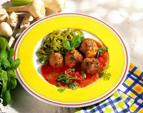 Wash and chop the herbs. Mix the steamed ingredients, herbs, squeezed bread roll, minced meat and egg to a mass. Season with salt and pepper. Form dumplings from it. Shortly before serving, fry in hot oil all around for about 8 minutes. Cook the noodles in boiling salted water for about 8 minutes. For the sauce, peel the garlic and press it through the garlic press. Chop the tomatoes finely. Heat the fat. Sauté garlic in it. Deglaze with canned tomatoes and juice, bring to the boil. Season to taste with salt and pepper.