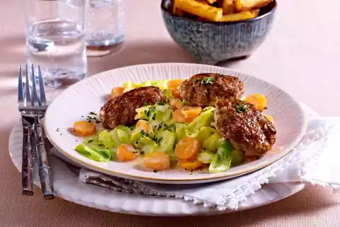 For the vegetables, peel, wash and slice the carrots. Clean, wash and quarter the pointed cabbage and remove the stalk. Chop the cabbage into small pieces. Heat butter. Sauté the vegetables for about 3 minutes. Dust with flour and sweat a little. Add milk while stirring. Bring to the boil and simmer for about 2 minutes. Season with salt and pepper. Wash and chop parsley. Add to the vegetables. Arrange vegetables, meatballs and roast potatoes.