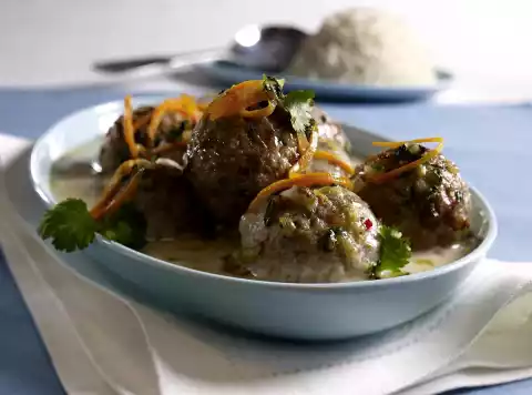 Season to taste with salt, pepper and soy sauce. Stir in the rest of the coriander. Heat the meatballs and carrots in the sauce. Serve with rice.