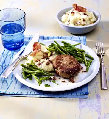 Melt the fat in the pot, toss the beans and parsley in the butter. Serve the beans with the meatballs and the bacon and mashed potatoes. Garnish the puree with the remaining bacon.